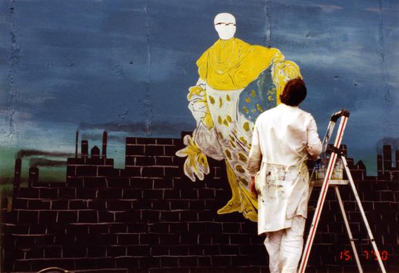 Karsten Wenzel bei der Arbeit an seinem Mauerbild "Die Beständigkeit der Ignoranz" an der 1,3 km langen East Side Gallery in Berlin-Friedrichshain