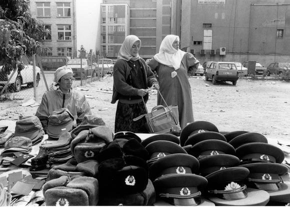 Verkauf von russischen Schirmmützen, Schulterklappen und Gürtelschnallen hinter dem