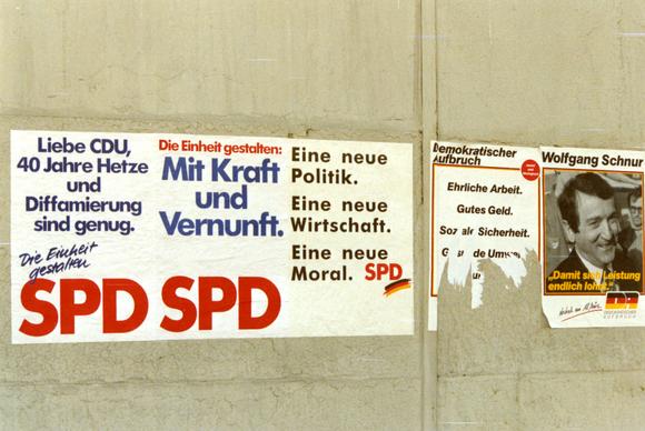 Concrete wall bearing various campaign posters for the SPD and Demokratischer Aufbruch
