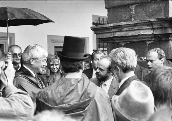 Dr. Schwarz-Schilling, von 1982 bis 1992 Bundesminister für Post und Telekommunikation, im Gespräch vor Schloß Friedenstein in Gotha