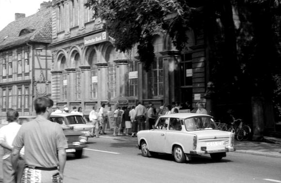 Warteschlange vor einer Filiale der Deutschen Bank in Halberstadt einen Tag bevor die Währungs-, Wirtschafts- und Sozialunion zwischen der Bundesrepublik Deutschland und der DDR in Kraft tritt