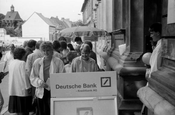 A queue outside a branch of the Deutsche Bank in Halberstadt, the day before the monetary, economic and social union between East and West Germany came into effect