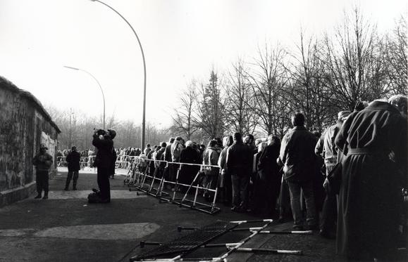 Warteschlange am Grenzübergang Brandenburger Tor, der am 22. Dezember 1989 feierlich eröffnet wurde. Zur Grenzöffnung durch den damaligen Bundeskanzler Helmut Kohl und den Vorsitzenden des DDR-Ministerrates Hans Modrow erschienen hunderte Kamerateams und mehr als 100.000 Menschen.