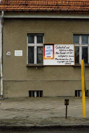 Side of the Catholic rectory St. Katharine; affixed between the windows is a wooden display case featuring a handwritten and printed CDU campaign poster