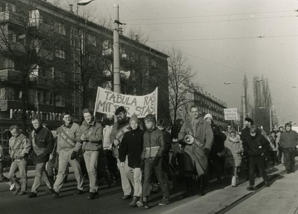 Demonstration, Keine Gewalt!, Kind, Megafon, Menschenmenge, Transparent (Spruchband), Wohnhaus