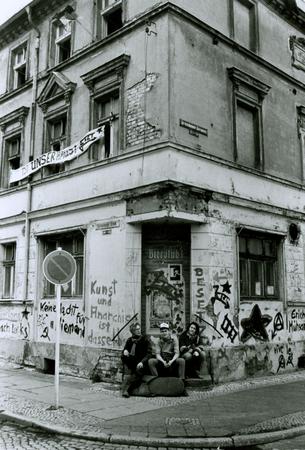 "Vor dem Eckgebäude Dresdener Straße (Königs Fritze). Erste Hausbesetzung im Osten Deutschlands, Jugendliche probieren alternatives Leben."