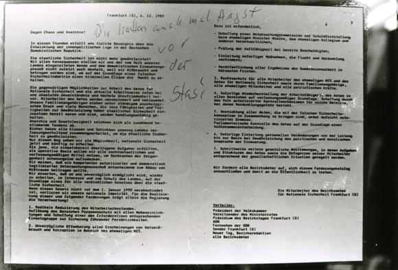Frankfurt (0), 6.12.1989 / Gegen Chaos und Anarchie! / In diesen Stunden erfüllt uns tiefste Besorgnis über die / Entwicklung der innenpolitischen Lage in der Deutschen / Demokratischen Republik. / Die staatliche Sicherheit ist nicht mehr gewährleistet! / Mit allen Konsequenzen stellen wir uns der vom Volk unseres / Landes eingeleiteten Wende und dem demokratischen Erneuerungs- / prozeß nicht zuletzt auch deshalb, weil wir mißbraucht und / betrogen worden sind, um auf der Grundlage einer falschen / Sicherheitsdoktrin einer kriminellen Clique die Macht zu er- / halten. / Die gegenwärtigen Möglichkeiten zur Arbeit des Amtes für / Nationale Sicherheit und die aktuelle Arbeitsweise rufen bei / uns absolutes Unverständnis und höchste Unzufriedenheit her- / vor. Mitarbeiter des Amtes werden verunsichert und verleumdet. / Unsere Familienangehörigen stehen unter ständigem psychologi- / schem Druck und viele Menschen, die ihre Fähigkeiten und Fer- / tigkeiten zur Gewährleistung hoher staatlicher Sicherheit ein- / zusetzen bereit waren und sind, werden handlungsunfähig ge- / halten. / Anarchie und Gesetzlosigkeit zeichnen sich als zunehmend be- / stimmende Tendenz ab. / Bisher haben alle Klassen und Schichten unseres Landes ver- / fassungserhaltend zusammengearbeitet, um die staatliche Sicher- / heit zu gewährleisten. / Nur diesen Weg sehen wir als Möglichkeit, nationale Sicherheit / jetzt und künftig zu erhalten. / Als jene, die einsatzbereit übertragene Aufgaben erfüllten, / als operative Basis wollen wir alle rechtsstaatlichen und / verfassungsmäßigen Mittel nutzen, um Verbrechen der Vergan- / genheit schonungslos aufzudecken. / Wir meinen, daß ein kompetenter autorisierter und demokratisch / legitimierter Untersuchungsausschuß entscheidend zum Abbau von / Mißtrauen beitragen sollte. / Wir erwarten, daß es uns unverzüglich ermöglicht wird, wieder / zu arbeiten, im Interesse und zum Schutz des Landes, auf der / Grundlage eines für alle verbindlichen Gesetzes über die staat- / liche Sicherheit. / Wenn dieses Gesetz nicht vor dem 1. Januar 1990 verabschiedet / ist, verlieren wir unsere nationale Identität. Für die Realisie- / rung dieser und folgender Forderungen trägt allein die Regierung / die Verantwortung! / 1. Radikale Reduzierung des Mitarbeiterbestandes. / Auflösung des Bereiches Personenschutz mit allen Nebeneinrich- / tungen und Schaffung einer den Erfordernissen entsprechenden / Einsatzgruppe zur Sicherung führender Persönlichkeiten. / 2. Unverzügliche Offenbarung aller Erscheinungen von Amtsmiß- / brauch und Korruption im Bereich des ehemaligen MfS. / Dazu ist erforderlich, / - Schaffung einer Untersuchungskommission zur Schuldfeststellung / beim ehemaligen Minister Mielke, dem ehemaligen Kollegium und / anderen Verantwortlichen; / - Prüfung der Haftfähigkeit bei bereits Beschuldigten; / - Einleitung sofortiger Maßnahmen, die Flucht und Verdunklung / verhindern; / - Veröffentlichung aller Ergebnisse der Kommissionsarbeit in / kürzesten Fristen. / 3. Rechtsschutz für alle Mitarbeiter des ehemaligen MfS und des / Amtes für Nationale Sicherheit sowie deren Familienangehörige, / alle ehemaligen Mitarbeiter und alle patriotische Kräfte. / 4. Sofortige Wiederherstellung der Arbeitsfähigkeit des Amtes in / allen Bereichen auf verfassungsmäßiger Grundlage. Schaffung durch / das Volk autorisierter Kontrollmechanismen für solche Bereiche, / bei denen Verdunklungsgefahr besteht. / 5. Vernichtung aller Arten, die mit der falschen Sicherheits- / konzeption in Zusammenhang zu bringen sind, unter Aufsicht auto- / risierter Gremien. / Parlamentarische Kontrolle des Amtes auf der Grundlage einer / Volkskammerentscheidung. / 6. Sofortige Einleitung personeller Veränderungen von der Leitung / bis zur Basis bei Gewährleistung des politischen und moralischen / Anspruchs der Erneuerung. / 7. Schrittweise weitere gesetzliche Bestimmungen, in denen Aufgaben / und Strukturen des Amtes sowie die Befugnisse seiner Mitarbeiter / entsprechend der gesellschaftlichen Situation geregelt werden. / Wir fordern alle Bezirksämter auf, sich diesem Forderungskatalog / anzuschließen und damit an die Öffentlichkeit zu treten. / Die Mitarbeiter des Bezirksamtes / für Nationale Sicherheit Frankfurt (0) / Verteiler: / Präsident der Volkskammer / Vorsitzender des Ministerrates / Präsidium des Bezirkstages Frankfurt (0) / ADN / Fernsehen der DDR / Sender Frankfurt (0) / Neuer Tag, Bezirksredaktion / alle Bezirksämter