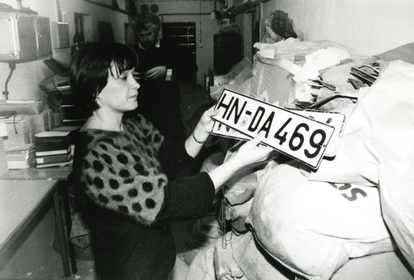 "Basement of the former Stasi building. Director of the Stasi archive shows counterfeit license plates."