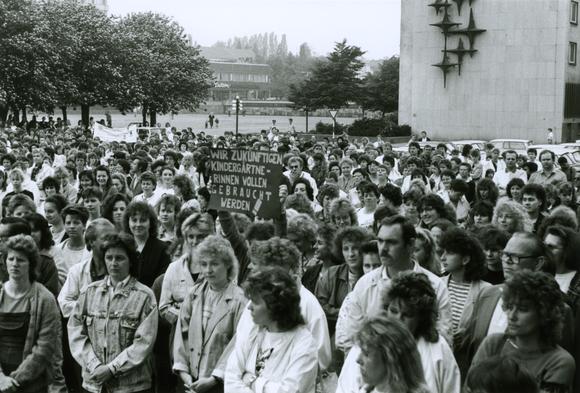 "Kindergarten teachers at a rally on the square in front of the townhall in Frankfurt (Oder). They were worried that they would lose their jobs after reunification."