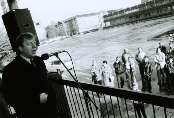"The Berlin Mayor, Diepgen delivers a speech to a crowd of few"