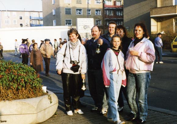 Gruppenfoto mit Sekt auf der Westseite des Grenzübergangs Heinrich-Heine-Straße, während der Zeit der Mauer einer der sieben Straßenübergänge zwischen Ost- und West-Berlin (zwischen sowjetischem und US-amerikanischem Sektor). Hier wurde der Waren- und Postverkehr zwischen den Stadthälften kontrolliert. Im Hintergrund die Berliner Mauer.