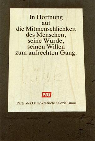In Hoffnung / auf / die Mitmenschlichkeit / des Menschen, / seine Würde, / seinen Willen / zum aufrechten Gang. / PDS / Partei des Demokratischen Sozialismus