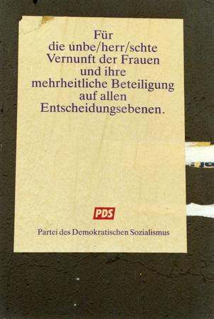 Für / die unbe/herr/schte / Vernunft der Frauen / und ihre / mehrheitliche Beteiligung / auf allen / Entscheidungsebenen. / PDS / Partei des Demokratischen Sozialismus
