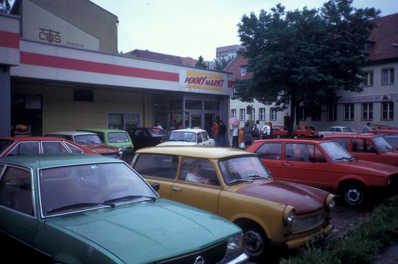inn, logo, parking spot, queue, rain, supermarket, Trabant (car)