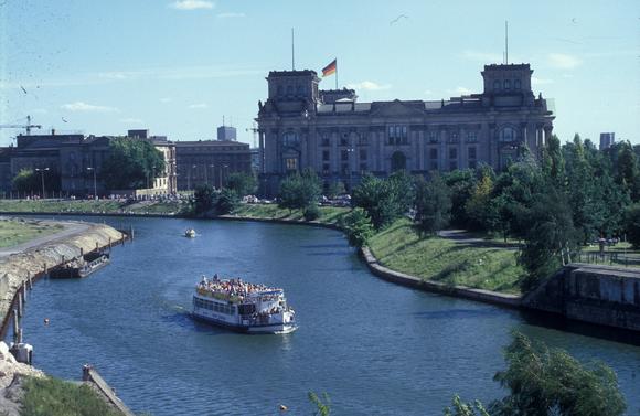 Blick von einem Wachtturm auf den Reichstag und die Spree, an der die Berliner Mauer verlief; links im Anschnitt der ehemalige Grenzstreifen