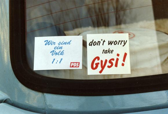 Erste freie Volkskammerwahl, Berliner Umland, Januar bis März 1990: PDS-Aufkleber "1:1 und Gysi" [80/207]