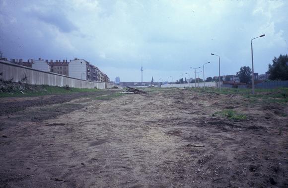 Partially cleared border strip with remnants of the Wall; the Berlin Wall to the left; the partially dismantled Hinterlandmauer (inner Eastern wall) to the right; the Berlin Television Tower in the distance