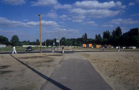 building site, cleared border strip, construction trailer, group of people, remains of the Wall