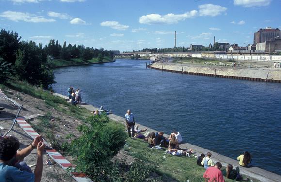 Pedestrians along the Reichstagufer; the partially cleared border strip with Hinterlandmauer (inner Eastern wall) and remnants of the dismantled Berlin Wall on the opposite bank; Charité Hospital in the background