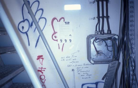 aus dem Turm / bitte nichts mehr / entfernen / Rettet es für unsere Nachkommen / damit sie sehen / können / wie unmenschlich / ein System / seine Bürger / einsperrte