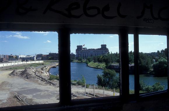 View from a watchtower onto the former border strip alongside the Spree river with the Hinterlandmauer (inner Eastern wall) and remnants of the dismantled Berlin Wall; the Reichstag in the background