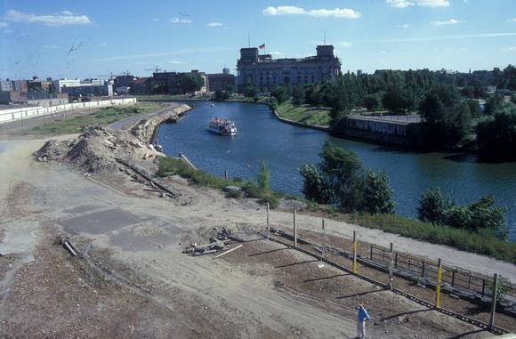 Blick von einem Wachtturm in den ehemaligen Grenzstreifen an der Spree mit der Hinterlandmauer und Resten der abgebauten Berliner Mauer, im Hintergund der Reichstag