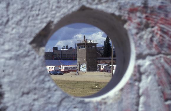 Wachtturm und Zirkuswagen im ehemaligen Grenzstreifen