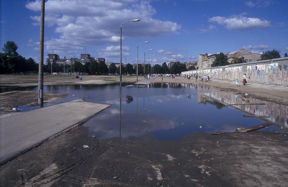 Überfluteter Kolonnenweg im ehemaligen Grenzstreifen an der Ebertstraße; links im Hintergrund der Reichstag und das eingerüstete Brandenburger Tor, rechts die teilweise abgebaute Hinterlandmauer
