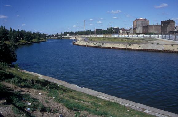 View from Reichstagufer of the Spree river, in which the border once ran during the time of the Wall; the partially cleared border strip with Hinterlandmauer (inner Eastern wall) on the opposite bank; the Charité Hospital in the background