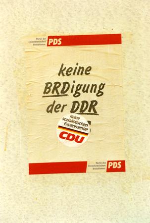 Wand mit PDS-Wahlplakat und darüber geklebtem CDU-Aufkleber