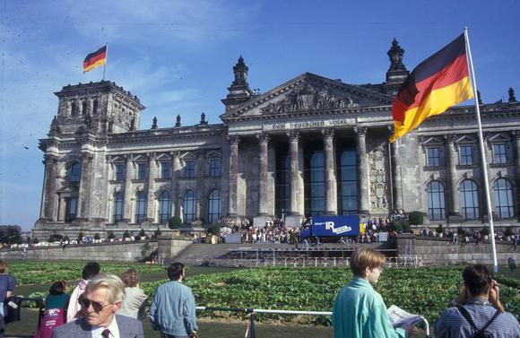 Auf dem Platz der Republik vor dem Reichstag, rechts im Bild die sechs mal zehn Meter große Fahne der Einheit (
