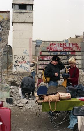 Blick durch die teilweise abgebaute Mauer auf den ehemaligen Grenzstreifen mit einem Wachtturm, davor ein Verkaufsstand mit DDR-Uniformen