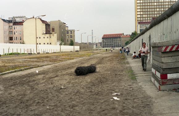 Im teilweise geräumten Grenzstreifen; links die Hinterlandmauer, rechts die Ostseite der Berliner Mauer, dahinter das Axel-Springer-Hochhaus