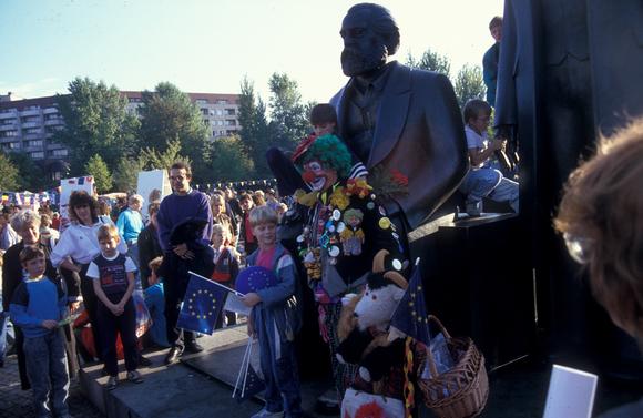At the sidelines of the reunification celebrations on Prachtstraße, Unter den Linden. The larger than life bronze statue of Karl Mark on Marx-Engels-Forum serves as a photographic subject