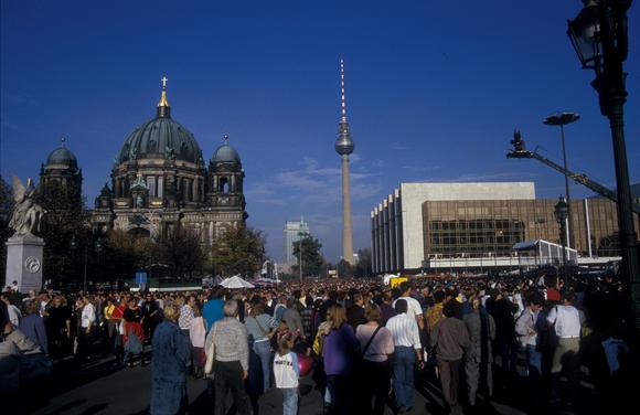 Reunification celebrations on Prachtstraße, Unter den Linden; the marble statues on Schloß Bridge in the foreground to the left; Berlin Cathedral, the Interhotel "Hotel Stadt Berlin", Berlin Television Tower and Palace of the Republic (which has since been torn down: