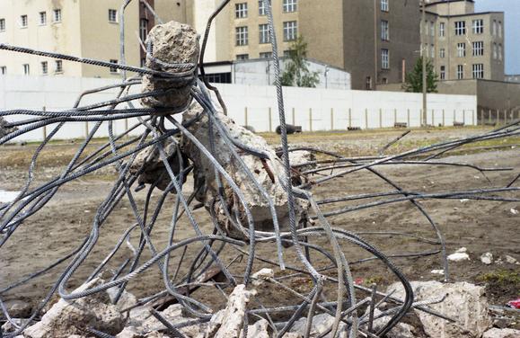 Reinforcement formations with chunks of Wall inside the partially cleared border strip; the Hinterlandmauer (inner Eastern wall) in the background