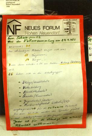 Ausschnitt eines Schaukastens des "Neuen Forum" in Hohen Neuendorf mit dem Protokoll einer Vollversammlung
