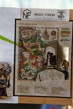 Plakat des Neuen Forum mit satirischer Landkarte, auf der weite Teile der DDR als Besitztümer führender SED-Politiker, militärische Sperrgebiete oder Mülldeponien dargestellt sind. Das Gedicht feiert die Rückeroberung des so genannten "volkseigenen" Landes durch das Volk im Zuge der friedlichen Revolution.