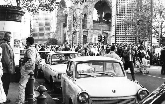 "Chaos, Chaos! Hier fährt nichts mehr: Die ersten Trabis und Wartburgs neben der Gedächtniskirche."