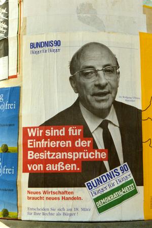 Bündnis 90 / Bürger für Bürger / Dr. Wolfgang Ullmann / Historiker / Wir sind für / Einfrieren der / Besitzansprüche / von außen. / Neues Wirtschaften / braucht neues Handeln. / Entscheiden Sie sich am 18. März / für Ihre Rechte als Bürger! / Bündnis 90 / Bürger für Bürger / Demokratie - Jetzt