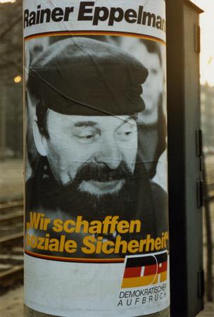 "Wir schaffen Soziale Sicherheit" ("We will create social security"). Advertising pillar with an election poster for DA (Demokratischer Aufbruch) featuring a portrait of Rainer Eppelmann