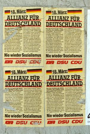 "Nie wieder Sozialismus" ("Never again Socialism"). A wall with four of the same, partly torn election programs for the Allianz für Deutschland (electoral coilition consisting of CDU-Ost, DA and DSU]