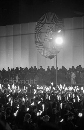 Fackelzug der FDJ am Vorabend des 40. Jahrestages der DDR, im Hintergrund die Ehrentribüne