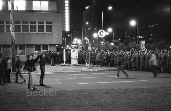 Polizeikette vor dem Sitz der DDR-Nachrichtenagentur ADN am 40. Jahrestag der DDR (