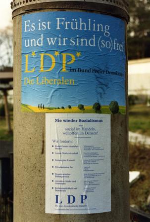 "Es ist Frühling und wir sind (so) frei" (It's springtime and we are (so) free"). Advertising column with an election poster for the LDP (Freie demokratische Partei der DDR (Free Democtratic Party of the GDR))