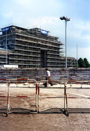Mauerrest vor dem eingerüsteten Brandenburger Tor