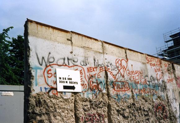 Berlin Wall (West), Berlin Wall graffiti (writing), chisel traces, signboard, Wall graffiti, Wall hole
