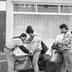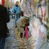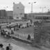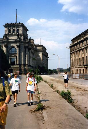Schüler und Passanten an der Stelle, wo die Berliner Mauer stand; im Hintergrund der Reichstag