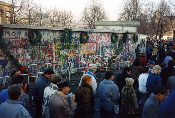 At the new Brandenburg Gate border crossing, which was opened in a festive ceremony on 22 December 1989. Hundreds of camera teams and over 100,000 people attended the ceremony presided over by then BRD Chancellor Helmut Kohl and the then GDR Chairman of the Council of Minsters Hans Modrow.
