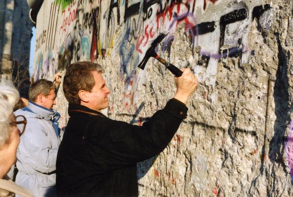 "Auf dem Foto versuche ich mit einem Zimmermannshammer einen Mauerstein abzuschlagen."